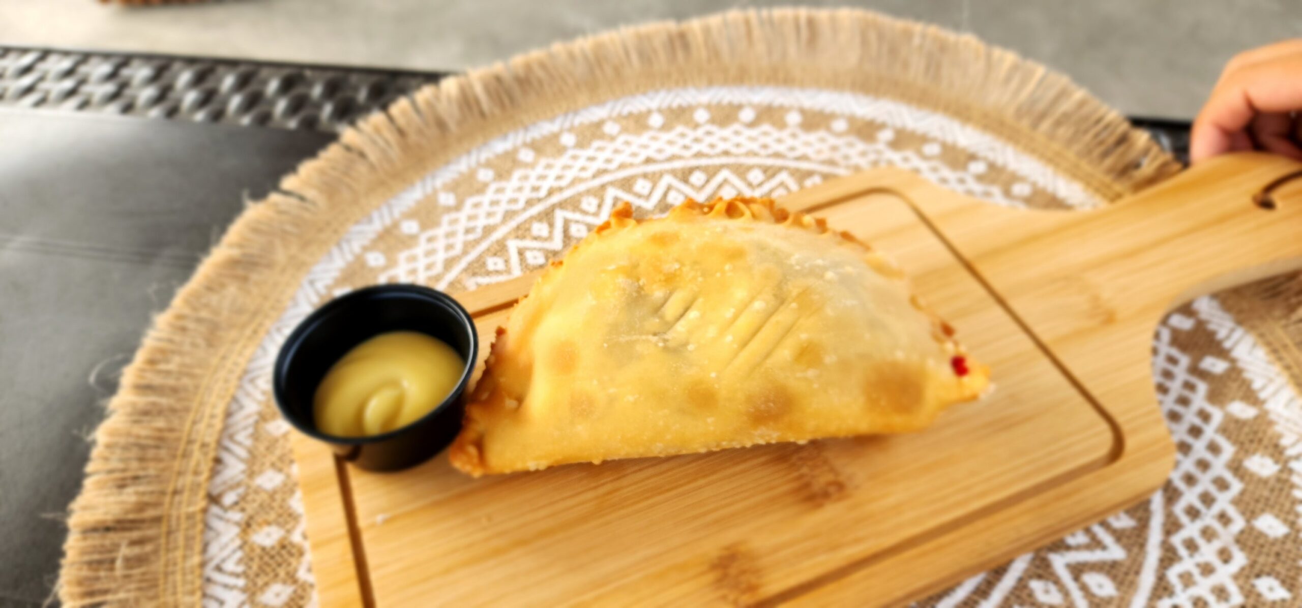 Es una empanada Artezanal con masa suabe Rellena de pechuga de pollo mechada con crema de queso philadelphia y puerro