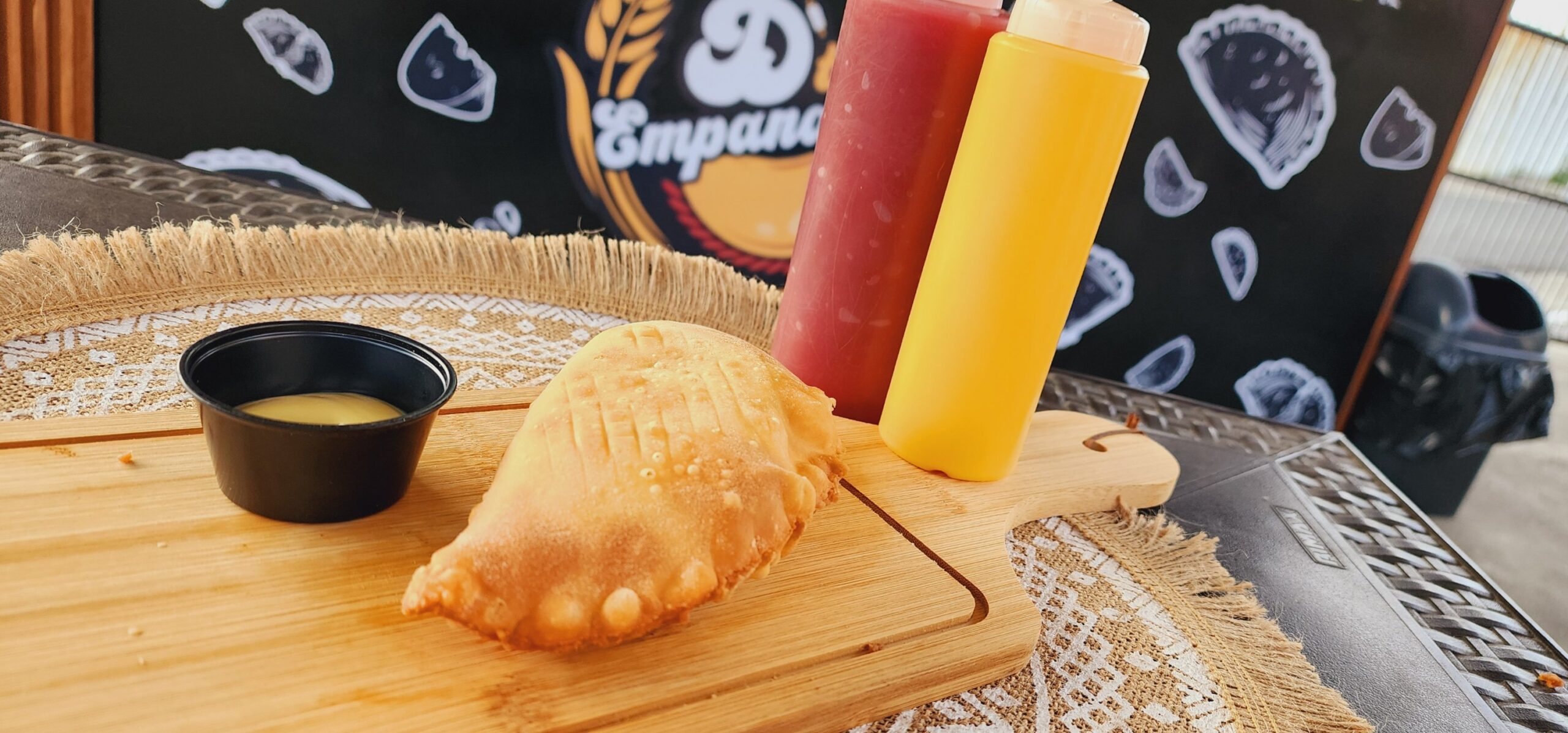 Es una empanada Artezanal con masa suabe Rellena de pechuga de pollo Mechada y 2 tipos de Quesos