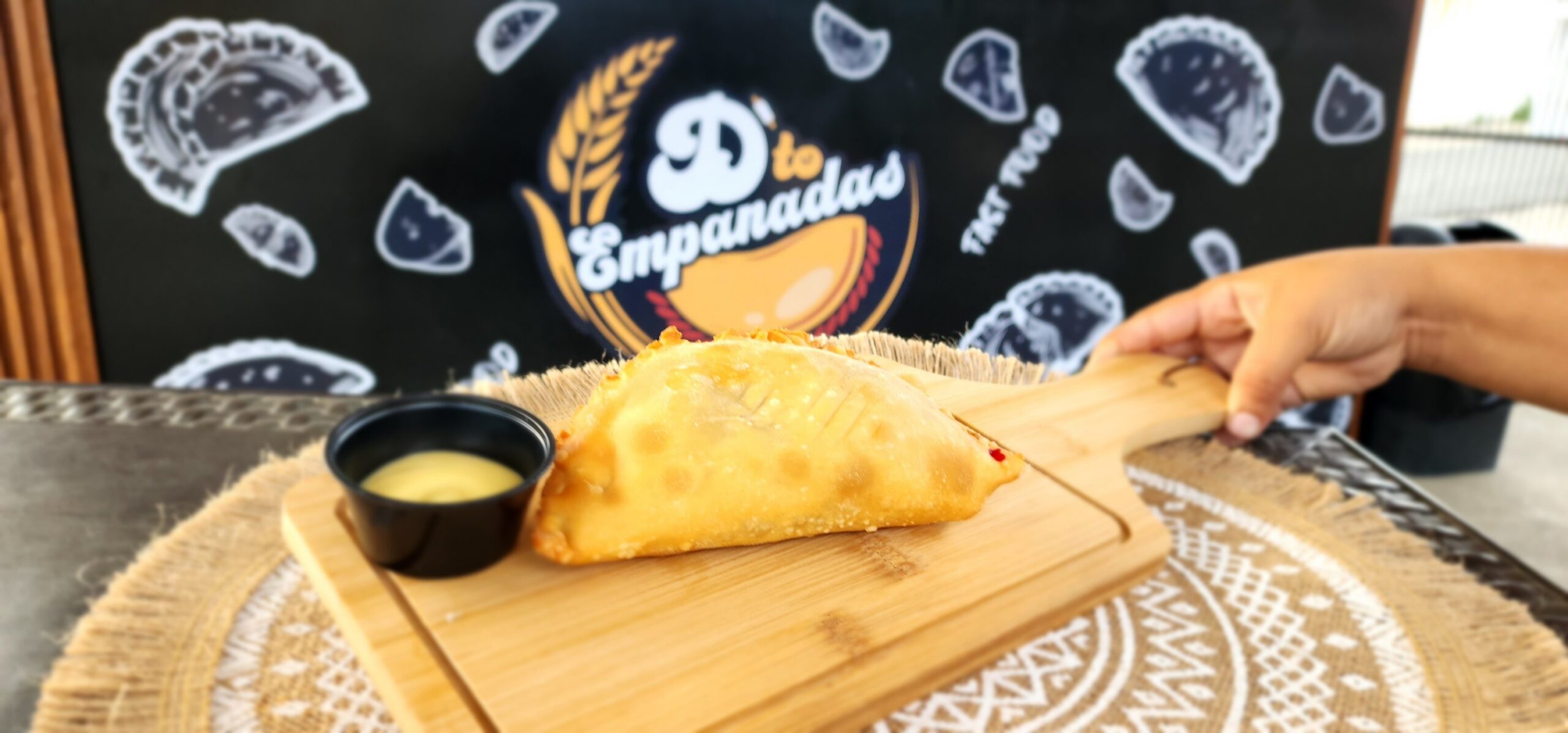 Es una empanada Artezanal con masa suabe Rellena de Res Molida y 2 tipos queso.