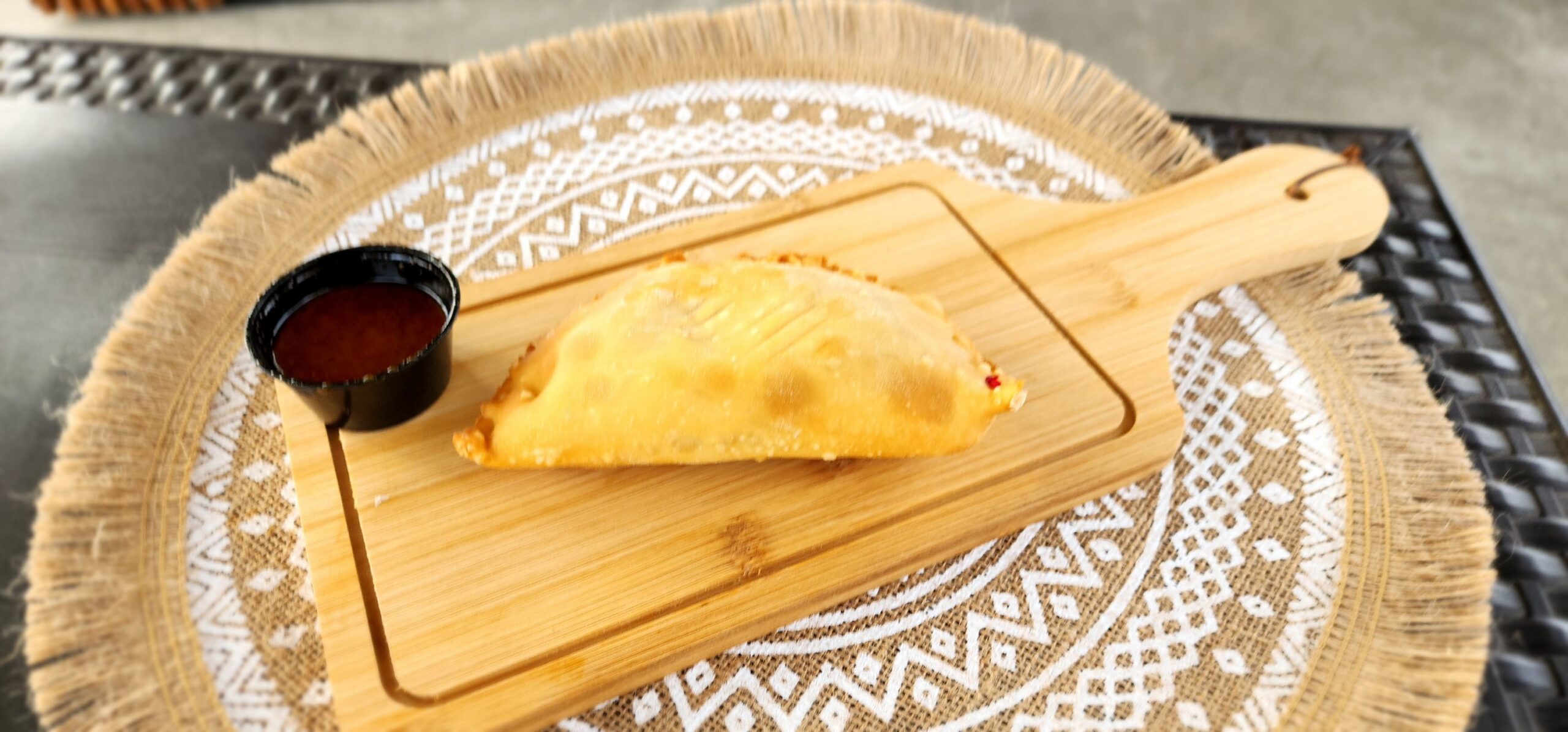 Es una empanada Artezanal con masa suabe Rellena de Salchicha y 2 tipo queso.