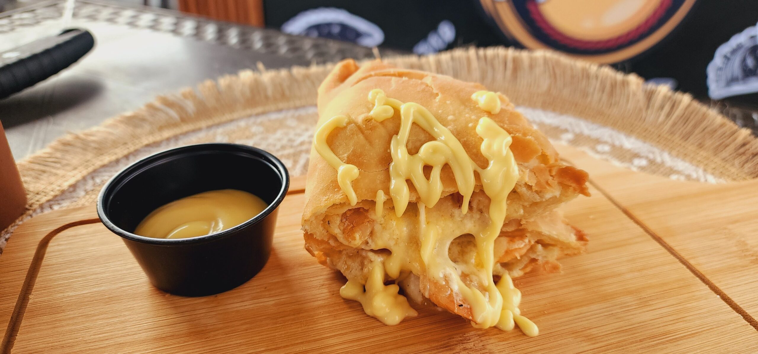 Es una empanada Artezanal con masa suabe Rellena de Camarones en salsa blanca con 2 tipos queso.